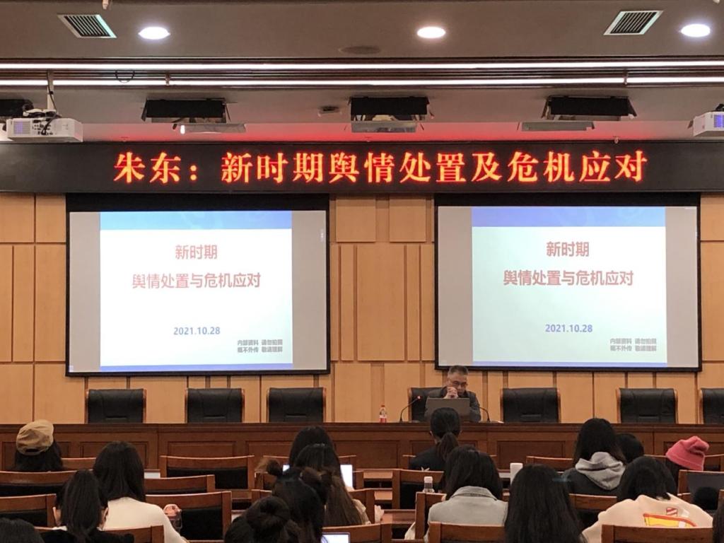朱东聚焦新时期网络传播路径、危机管理的策略与方法以及互联网时代的媒体应对等课题,紧密结合自身实践经历、实际案例,深入浅出、全面系统的讲解了舆情发展与危机应对的内在规律,以及应对处置策略技巧等方面内容。使与会人员对新媒体背景下舆情处置与危机应对的重要性有了深刻认识,同时对舆情处置与舆论引导的基本原则、方法手段有了进一步了解。部分员工结合自身专业提出了自己的问题,朱东一一解答,和广大师生进行了讨论。