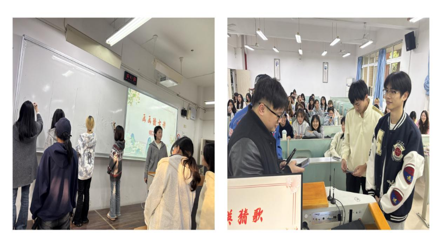 本次活动在雷鸣般的掌声中拉开帷幕。“知识抢答”“画画猜古诗”“中译英猜歌”等游戏环节“趣味连连”,现场欢声笑语不断,活动的“欢乐值”一路飙升、奔向高潮。“各类游戏花样百出、精彩迭出,使我意犹未尽、流连忘返。”来自二班的同学向磊高兴地说道。