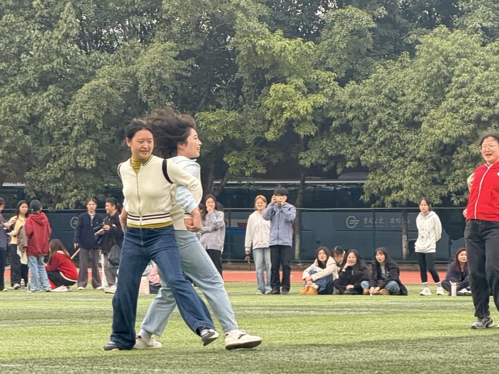 塑胶跑道上,“8”字跳绳比赛正激情开展。同学们心连心、排成排,在跳绳上“翻飞起舞”,每一次跳跃都谱写了团结与奋进的青春乐章。