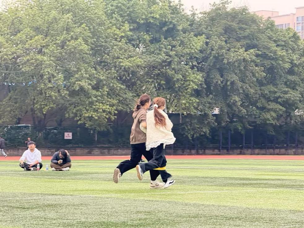 参加“两人三足”比赛的选手们用绳带将相邻的脚踝如石榴籽般紧紧“抱”在一起。哨声一落,他们同步迈出绑在一起的脚,汗水里是并肩作战的欢喜。在这短短的一瞬间,他们跑出了青春的速度、冲出了独属于“文新学子”的默契。