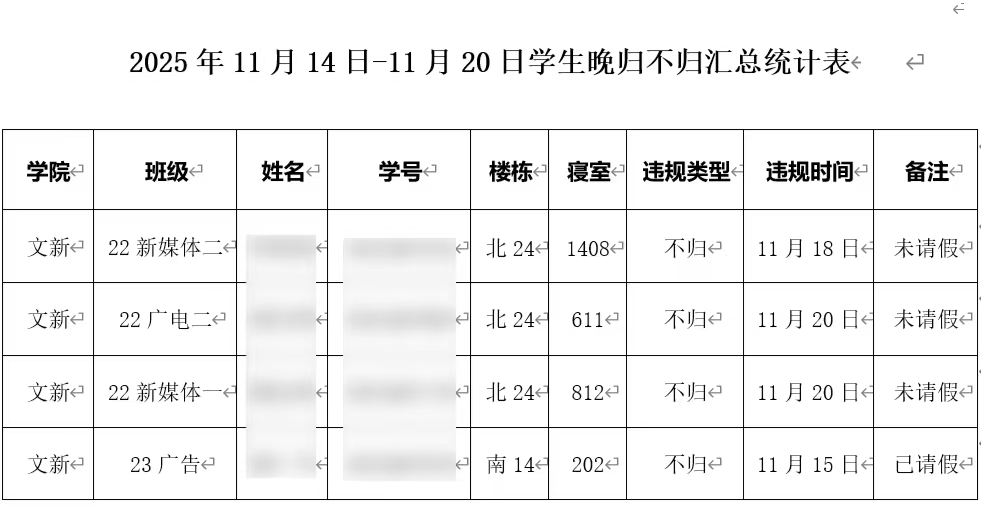针对学院部分同学不请假彻夜不归或晚归情况,辅导员已第一时间与相关同学进行了解,知晓了同学不归、晚归的具体原因。学院现对上述不请假晚归不归同学进行通报,提醒其重视作息时间与安全要求,避免类似情况再次发生,希望以上受通报的同学严守校规校纪,合理安排学习、生活时间。